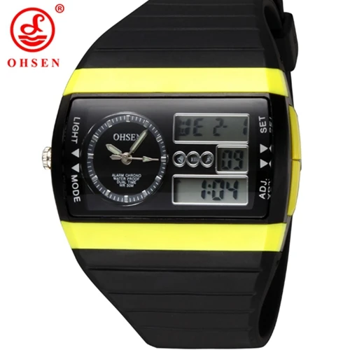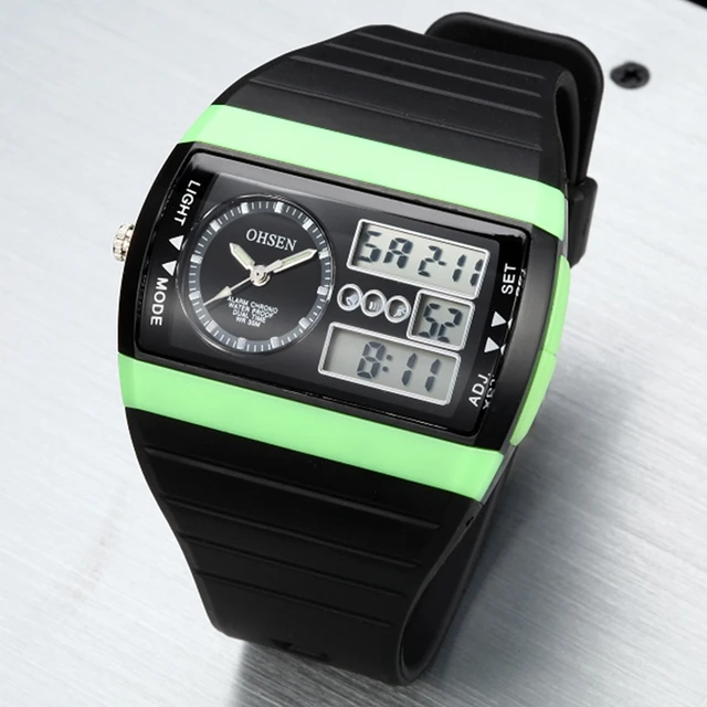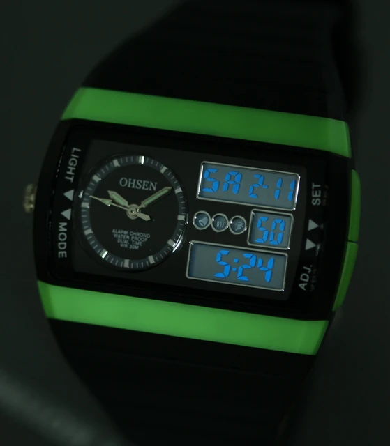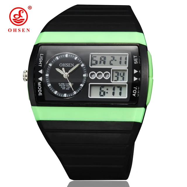 | [해외]2016 럭셔리 브랜드 새로운 ohsen relogios masculinos 디지털 석영 스포츠 남성 시계 녹색 다이얼 30 메터 다이빙 실리콘 lcd 시계 |