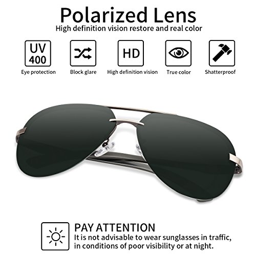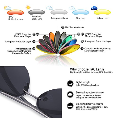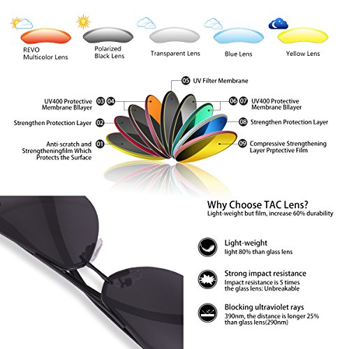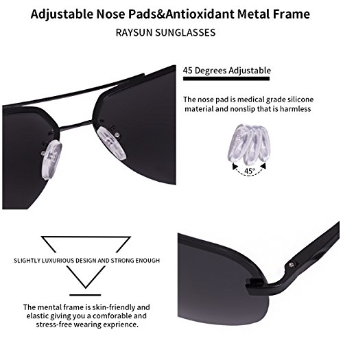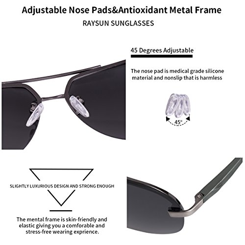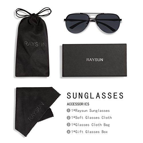 -. Feature : POLARIZED LENS - specialized multi layer lens designed to 100% UV400 eye protection effectively filter and block over 99.96% of glare. These lens are are tough, lightweight, scratch resistant, and have high optical clarity (distortion free, clear vision), making them an excellent choice for general outdoor and water sports activities. / HIGH QUALITY FRAME - made with metallic alloy that is ultra light weight yet strong and durable. It comes with spring loaded hinged legs and adjustable silicon nose pads which allows for maximum comfort and flexibility. / TAC POLARIZED LENS- 100% UV400 protection coating, blocks 100% harmful UVA & UVB Rays. Restore true color, eliminate reflected light and scattered light and protect eyes perfectly. TAC lens includes 7 layers. The 1st layer is polarization layer. The 2nd and 3rd layers are bonding layers to enable durability. The 4th and 5th layers are UV protection layers to absorb UV light. The 6th and 7th layers are shatterproof layers. / PERFECT ALL ROUNDER - RAYSUN Vision sunglasses being Polarized and 400UV protection makes these sunglasses the perfect choice for outdoor sports and activities such as driving, fishing, skiing, travelling, hiking, boating, and is suitable as high fashion accessory and daily wear all year round. It is also gift packaged ready, making it a wonderful yet practical gift idea for friends and family! / 100% RISK FREE PURCHASE - All RAYSUN Aviator Sunglasses comes with a 1 year warranty on frames and lens as well as a 30 Day Money Back Guarantee when purchased from authorized dealers. So if you are not completely happy with your purchase for whatever reason, let us know and we will provide you the best service!
