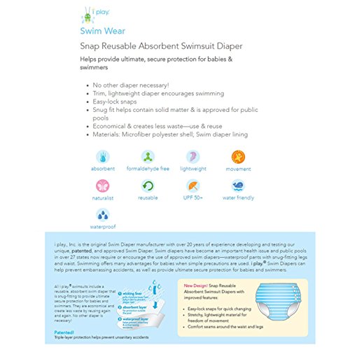 -. Feature : Essential baby swim bundle includes 1 Iplay swim diaper and 1 swim diaper wet bag. Iplay reusable swim diapers can be worn alone as a swim suit bottom or under a standard swimsuit, swim trunks, or bikini bottom as a swim diaper. Boys and girls swimsuits are 1 piece with a microfiber polyester outside with swim diaper lining. Pull up swim diaper has an absorbent lining built in. All Iplay's swimwear has UPF 50+ sun protection. Swimsuit diapers are available in a variety of colors and P.R.Ints. / NO OTHER SWIM DIAPER IS NECESSARY! Trim, lightweight diaper encourages swimming; Easy-lock snaps Snug fit helps contain solid matter and is approved for public swimming pools (many other swim diapers are not). Economical and creates less waste - use and reuse! Comfort seams around the waist and legs. PATENTED! TRIPLE LAYER PROTECTION HELPS PRVENT UNSANITARY ACCIDENTS. / Iplay swim diapers protect your baby while remaining PVC FREE, Naturally absorbent without gels or harsh chemicals, Formaldehyde Free, Lightweight, and Encourages Movement. All of Iplay's products are developed based on 4 P.R.Incipals FUNCTION; HEALTH AND SAFETY; DEVELOPEMNT, and THE NATURAL WORLD! Iplay babywear ultimate swim diapers have features that make them superior to the rest: all seams are double-stitched for maximum durability. / Iplay's high quality workmanship is made to last all season and maintain its shape; fabrics have excellent chlorine and saltwater resistance. Swim Diaper Wet Bag: stores wet swim diaper after use. Durable eva wet bag holds up to 2 swim diapers. They are also great for bibs, burp cloths, wipes, breast pads, and more. Wet bags help keep soiled garments away from your other clean items. Bag can be easily cleaned. We recommend brining at least 1 extra swim diaper to the pool or beach. / Iplay Swimwear: Iplay Inc. is the original swim diaper manufacturer with over 20 years of experience developing and testing their unique patented and approved swim diaper. Swim diapers have become an important health issue. Public pools in over 27 states now require or encourage the use of approved swim diapers-waterproof pants with snug-fitting legs and waist. Iplay swim diapers help prevent embarrassing accidents, as well as provide ultimate secure protection for babies and swimmers.