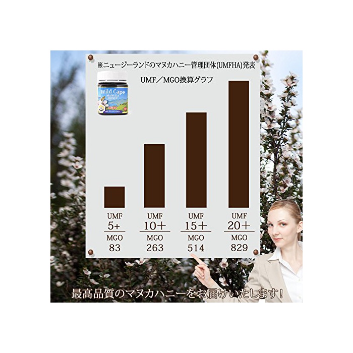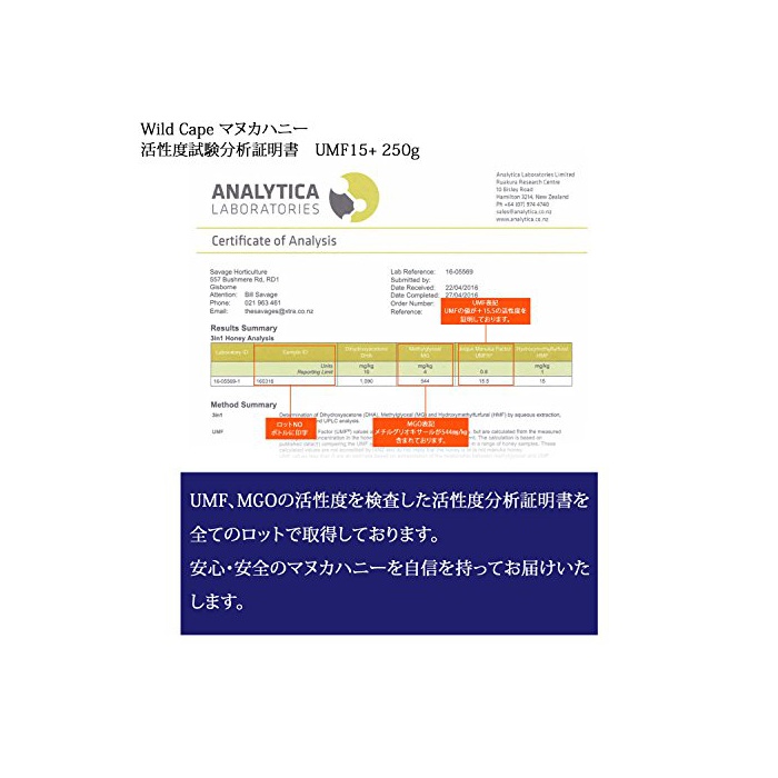 원본상품명: Wild Cape (ワイルドケプ) マヌカハニ UMF15+ MGO500+ 250g ニュジランドマヌカハニ協(UMFHA)認定 成分査成績書取得