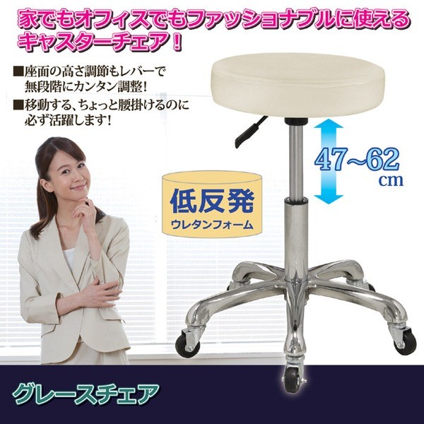 キャスター付きスツール(グレースチェア) 無段階高さ調節可 低反発ウレタンフォーム使用 ブラック(黒)