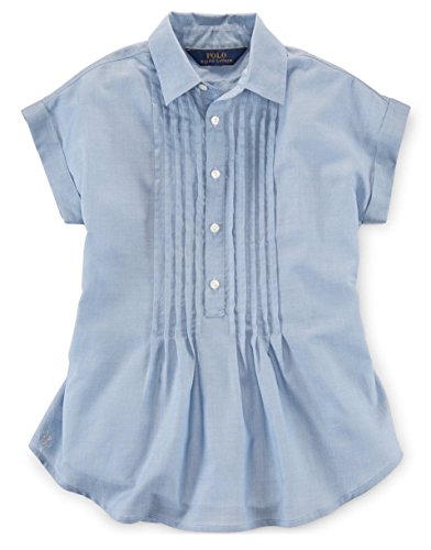 This precious rendition of a timeless pleated cotton shirt by Ralph Lauren is made with pretty pintucking details and cap sleeves. It's a perfect choice with her favorite pants or denim. •Spread colllar •Cap sleeves •Buttoned placket with pintucking at each side •Curved hem •Embroidered 'RL"" at the right side of the hem
