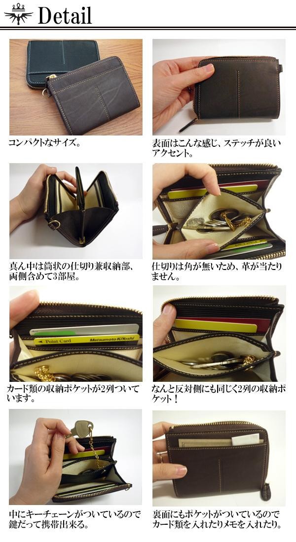 | 大人なデザインで触り心地が良い革製の財布。ステッチが良いアクセント。内部には筒状の仕切り兼収納部があり、両側含めて3部屋に分かれています。両側はカード類の収納ポケットがそれぞれ2列。仕切りの中にキーチェーンがついているので鍵も携帯出来ます。裏面にもポケットがついているのでカード類を入れたりメモを入れたりと便利に使って頂けます。 |