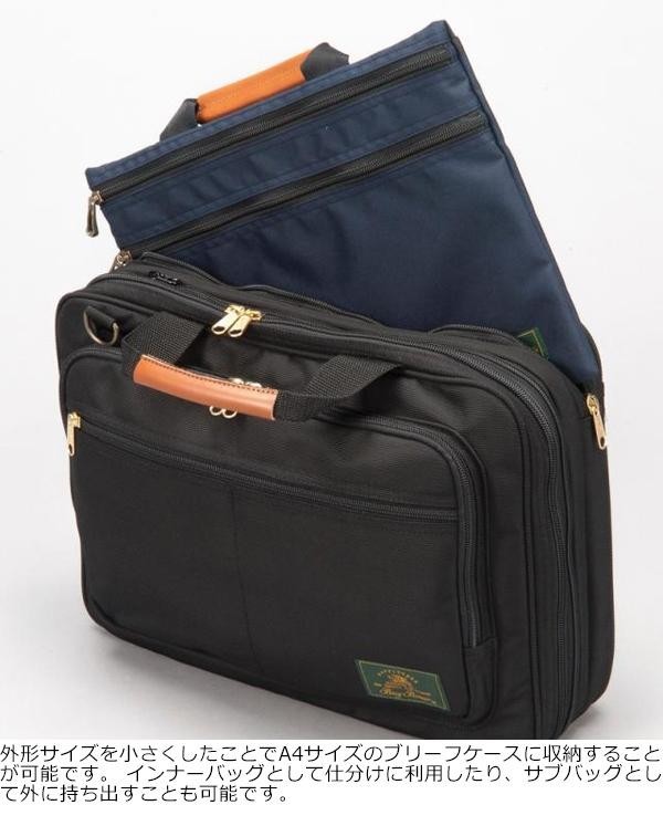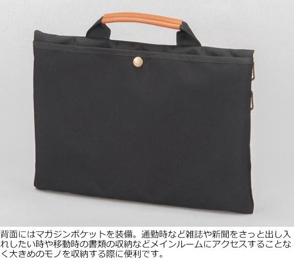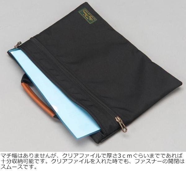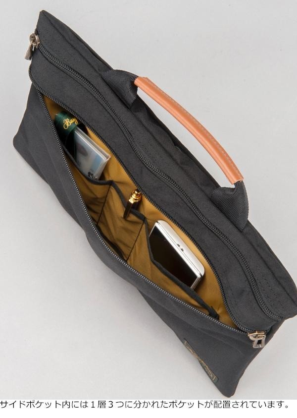 | 最大収納サイズはA4クリアファイルが入る大きさになっており、単体としては勿論、バッグインバッグとしてもお使いいただけます。この製品に使用しているポリエステルコーデュラは摩擦・引き裂き・すり切れ等に対する強度を備え、表面にはテフロン(R)加工を施し撥水性・防汚性を高めてあります。610デニールという繊維の太さはバッグで使用する上では十分な強度と軽さが取れたモノです。 |