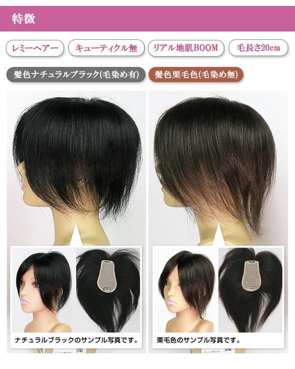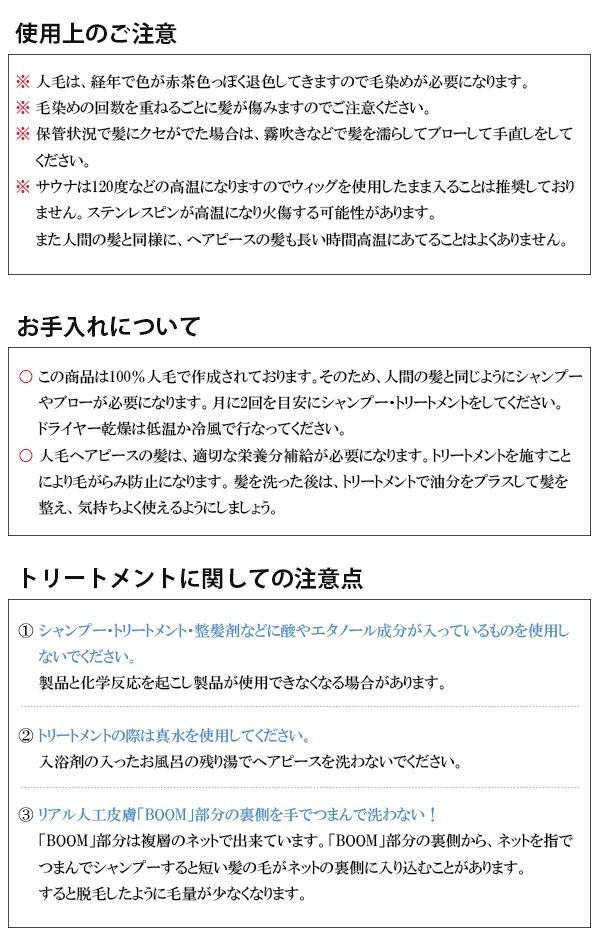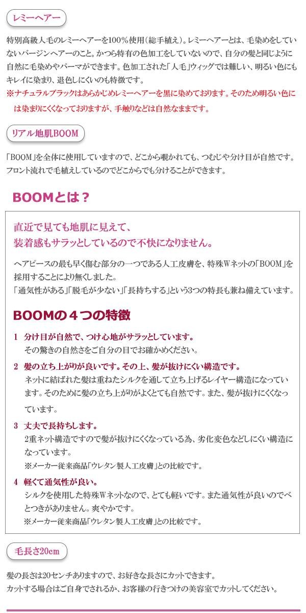 | 特別高級人毛レミーヘアーを100%使用したヘアピースで、カラーやパーマが可能です。ベース全体にリアルな地肌「BOOM」を使用しているので、つむじや分け目がとても自然です。フロント流れで毛植えしているのでどこからでも分けることができます。(ナチュラルブラックはあらかじめレミーヘアーを黒に染めております。そのため明るい色には染まりにくくなっておりますが、手触りなどは自然なままです。) |