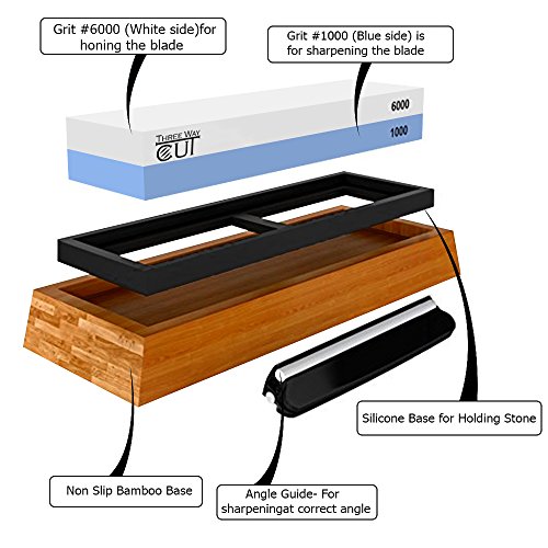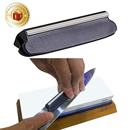- PREMIUM KNIFE SHARPENING STONE KIT: Our professional knife sharpening stone set includes high quality 2 in 1 whetstone (#1000/ #6000) , Sophisticated and elegant Anti slip bamboo base holder, Silicon base for holding the stone ,FREE BONUS sharpening angle guider for easier use.
