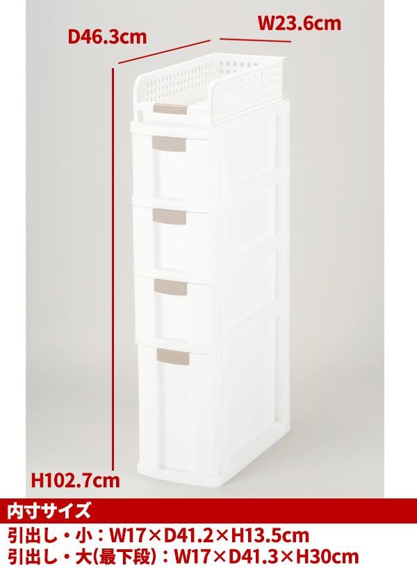 | サイズ | 本体サイズ:W23.6×D46.3×H102.7cm、引出し(大)内寸:W17×D41.3×H30cm、引出し(小)内寸:W17×D41.2×H13.5cm 個装サイズ:25×47×105cm |
