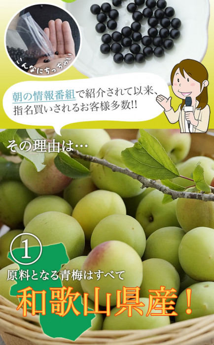 | 原材料 | 名称:梅肉エキス 梅エキス、カンショ、でん粉、食物繊維、カキ殻末 |