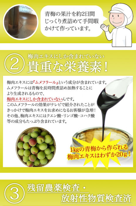 | 梅肉エキスをそのまま飲むのはちょっと苦手…そんな方にオススメなのが粒タイプ。梅肉エキスにしか含まれていない「ムメフラール」ももちろん豊富に含まれています!1日5~10粒を目安に、是非毎日の健康管理にお役立てください。 |