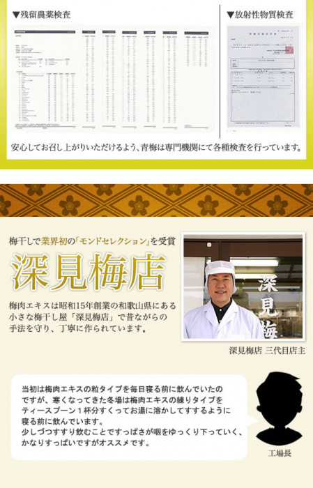 | 製造(販売)者情報 | 【製造者】 有限会社 深見梅店 和歌山県西牟婁郡上富田町岩田2483-1 |