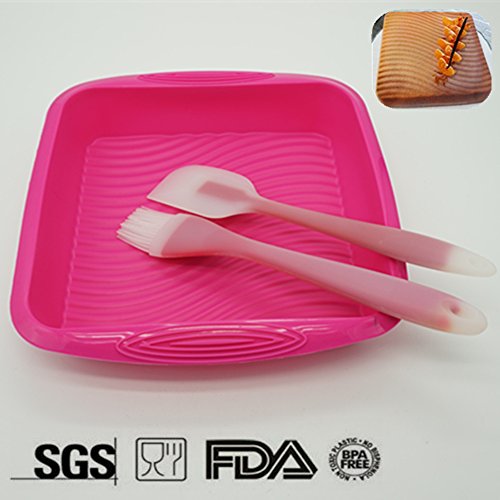 Nonstick Bakeware 3-Piece Set – Square Cake Pan Baking Mold Meat Loaf bread Pie set with Spatula and Brush, Extra Thick and Solid Silicone, FDA Approved (Pink)
