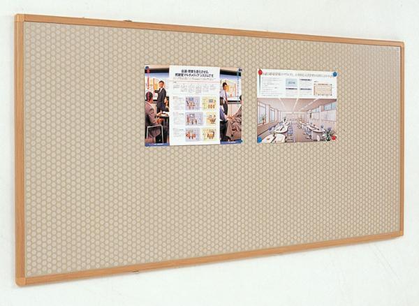 | 板面にパンチングメタルを圧着した表面構造なので、マグネット・押しピン・セロテープなどを使って掲示物の保持力が抜群です。パンチングメタル穴に合わせて掲示物をすぐに貼れます。 |