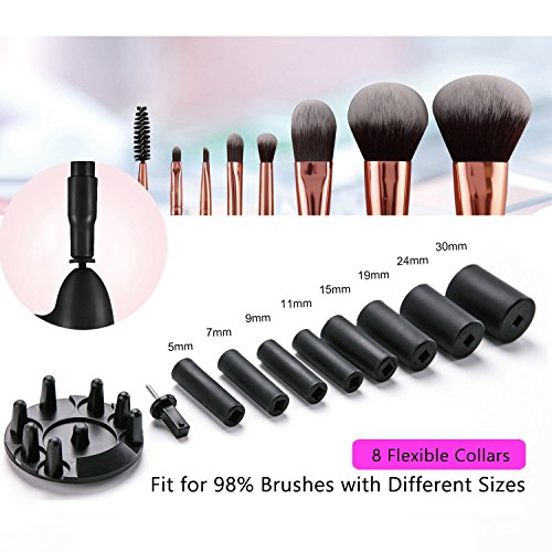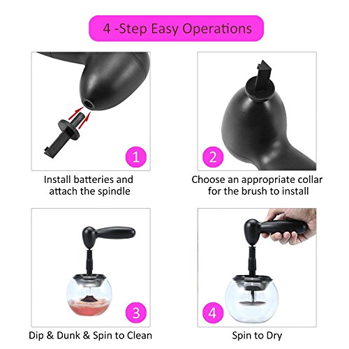 - [ Easy to Use ] – Just 4 Steps: 1. Put water & soap into the plastic bowl; 2. Dip & dunk the brush in soap water; 3. Spin the brush to clean it; 4. Spin the brush to dry it. In addition, 8 collars of different sizes fit for most makeup brushes.