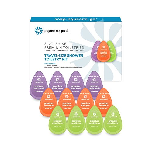 Squeeze Pod Travel Size Toiletry Shower Kit – 12 Assorted Single Use Pods - Leak Proof & TSA Approved. 4 Each of Natural Shampoo, Conditioner & Body...
