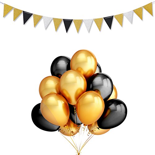 -. Feature : Sufficient party decoration supplies:leesky 100 pack gold & balck color latex ballons and 1 pack gold & balck & white color vintage style pennant banner,every thing you need for a perfect birthday party decorations. / 1 pack shining gold& black & white color vintage style pennant banner: pennant garland can be adjusted,you can move the pieces around if you would like to have a different look. / Perfect for all occasions: perfect for weddings celebration,reunion's carnival parties,1st birthday party, bridal shower,ner year party,golden years party,holiday party,baby shower parties, chritmas parties, anniversary celebrations,dances,black and white party,birthday parties,going away party,or any party you can image. / Long lasting and strong: leesky gold & black color latex balloons are made from durable latex material,our gold & black color party balloons are strong and long lasting, and you won't have to worry about them tearing or bursting when inflated. / 100% satisfaction money back guarantee - no conditions - your satisfaction is guaranteed.