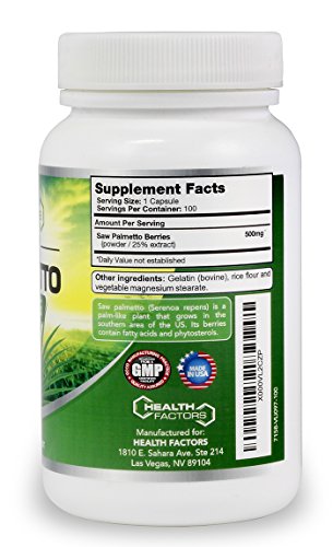 -. Feature : SAFETY: Our Saw Palmetto super complex is 100% safe, real and natural. It's grown in the US and then made in the US in a modern, FDA-inspected facility that follows extremely strict current Good Manufacturing Practices (cGMPs). Thorough laboratory testing is done to ensure you get the safest and purest saw palmetto capsules, starting with the raw ingredients to the final saw palmetto encapsulations in gelatin capsules. / ABOUT US: Health Factors sells vitamins and supplements that enhance good dietary practices. This product is from wild saw palmetto berries and contains natures nutrients, which support vital prostate and urinary tract maintenance. It's free from harmful additives and preservatives. / SUPPORTS PROSTATE HEALTH & FIGHTS HAIR LOSS: This natural prostate supplement supports prostate health and fights hair loss. Saw palmetto berries contain natural sterols such as beta-sitosterol and fatty acids, which have been reported to inhibit the effects of 5 alpha reductase, which helps convert testosterone to DHT. DHT causes prostate problems such as benign prostate hyperplasia or BPH (enlarged prostate gland), which can cause frequent urination, also known as nocturia. DHT also causes male hair loss. / WHY US?: We give you a safe, pure, extra strength, whole saw palmetto berry formula that combines both dried berries with an actual saw palmetto extract to provide even more plant sterols. We want you to have the best prostate supplement to help you stay healthy. Other formulas are lower-quality or are more expensive. These saw palmetto pills are P.R.Iced very competitively and we offer a 100% money-back guarantee. If you don't like the results, you'll get a full and prompt refund - even if you return the bottle empty. / OTHER SPELLINGS: Saw Palmetto is sometimes misspelled or spelled differently, for example: saw pallmeto, saw palmeto, saw-palmetto or saw palmento.