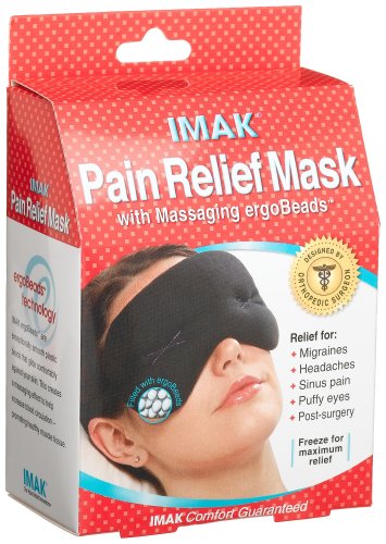 Pain Relief Mask with Massaging ergoBeadsTM Relief for: Migraines Headaches Sinus pain Puffy eyes Post-surgery IMAK Comfort Guaranteed Latex Free ergoBeadsTM technology - IMAK ergoBeadsTM are exceptionally smooth plastic beads that glide comfortably against your skin. This creates a massaging effect to help increase blood circulation -- promoting healthy muscle tissue. Key Benefits: Cool relief without shock of ice or gel masks Gentle, soothing compression ergoBeadsTM feel naturally cool Freeze to enhance effectiveness Designed in the USA by a physician Filled with ergoBeadsTM for cooling relief Breathable cotton Lycra® Two sewn darts leave comfortable room for your eyes and lashes Elastic strap keeps Mask in place For warranty registration visit: imakproducts.com/warranty Made in ChinaFeature