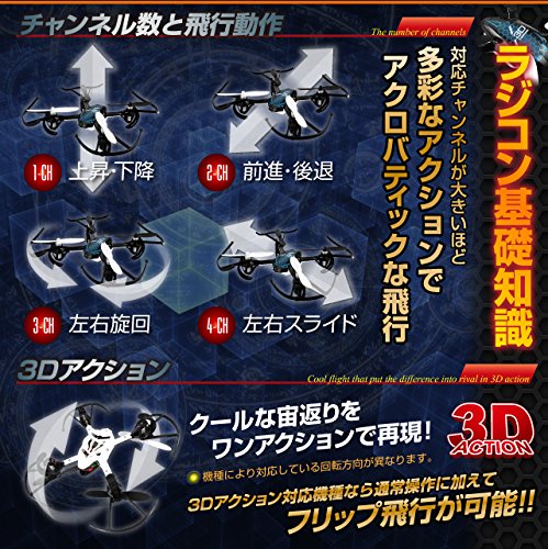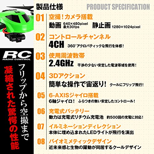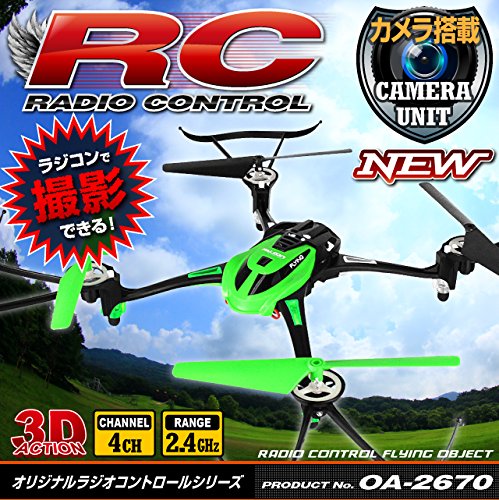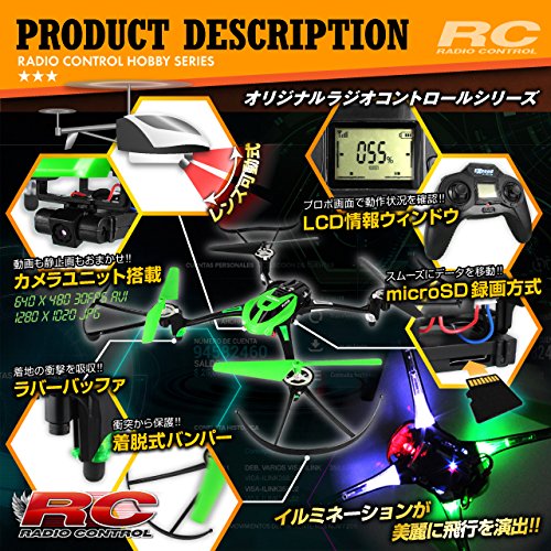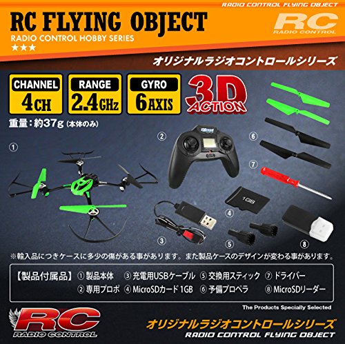 -. Feature : 【商品説明】◎大人がハマる面白さ!オリジナルラジオコントロールシリーズ! ◎陸・海・空を制する!トイからホビーまで充実のラインナップを刮目せよ! ◎メーカー直輸入だからできる大特価!売り切れ御免! / ●空撮!カメラ搭載!動画も静止画もプロポ操作で思いのまま! ●SDカード&カードリーダー付属だからすぐに撮影!すぐに再生! ●4CH対応!上昇下降、前進後退、左右旋回、水平移動とコントロール自在! ●2.4HGz帯使用!混信の無い安定した電波帯域で快適なフライト! / ●ワンアクションで3Dフリップ飛行!ワンランク上のパフォーマンス! ●付属の専用プロポは初心者でも安心の快適な操作感! ●衝突、墜落時にも破損しづらい柔軟性の高い主翼&尾翼! ●プロペラ部にはバンパーを装備し、さらに耐衝撃性をアップ! ●LEDイルミネーションが飛行をオシャレに演出! / 【注意事項】・お子様がご使用になる場合は、必ず保護者の方が一緒に遊んでください。 ・利用前のメンテナンスや利用判断は利用者に委ねられておりますので、自己責任にて行ってください。 ・プライバシーの侵害・迷惑防止条例等に抵触する悪質な行為には使用しないでください。 ・輸入品につき、製品パッケージに若干のキズ・汚れがある場合がございます。 ・製品機能やデザイン、パッケージは改良等のため予告無く変更となる場合があります。 / ・十分な広さがあり、道路や電線等周囲に危険が無い場所でご使用ください。 ・海外メーカー直輸入品であるため技適マークを取得していません。予めご了承ください。 ・輸入品につき、プロペラ等部品の個別販売ならびに修理は行っておりません。予めご了承ください。 ・本製品ご利用による直接的・間接的ないかなる損害・損失についても当社では一切の責任を負いかねます。
