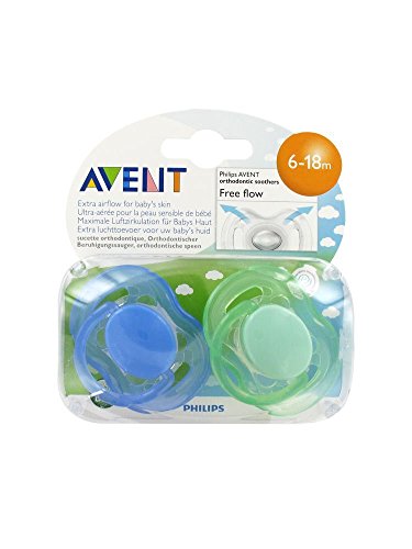 -. Title : Avent 2 Orthodontic Silicone Free Flow Soothers 6-18 M - Colour : Blue and Green