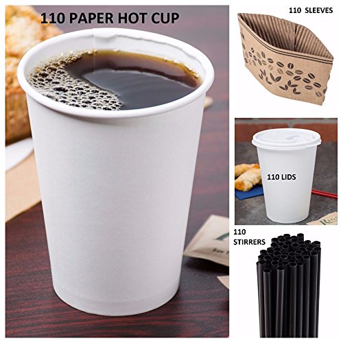 Product Description FANTASTIC PACK ! All you ever need to your Office, Party or Event. It comes with 110 - Paper Coffee Hot Cups 110 Travel Lids 110 Sleeves Stirrers -12oz / 360ml - WHITE - Office/Party Pack - to go Coffee Cups, Disposable Travel Mug Cover Hot/Cold Coffee, Tea Chocolate 0