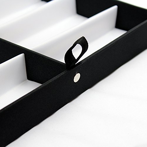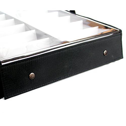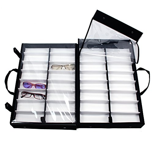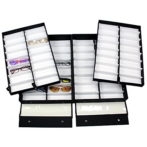 UNIQUE DESIGN: Vinyl clear top for easy viewing. Elegant white fabric lining for display. Two removable eyeglasses trays with one finger grip area on each tray to make it easier to move out.