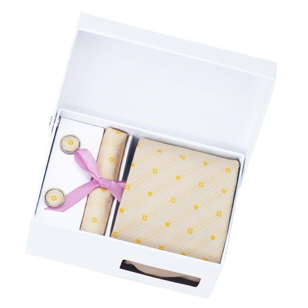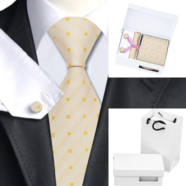 | [해외]HN-1041 남성 실크 넥타이 빛 노란색 베이지 넥타이 손수건 커프스 단추 선물 상자 가방 세트 남성 웨딩 파티 |