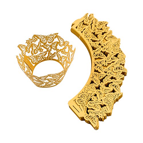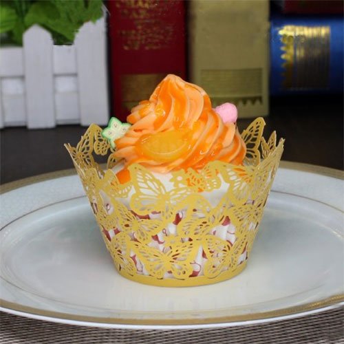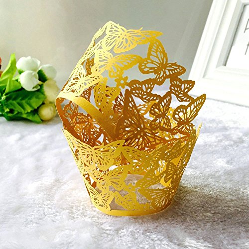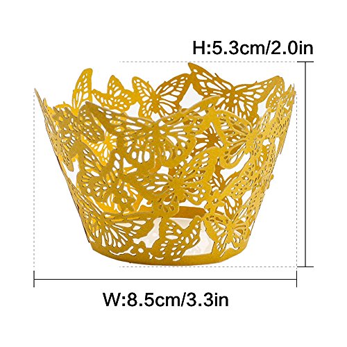 PAMISO Cupcake Holders (100pcs) Filigree Artistic Bake Cake Paper Cups Decor Wrapper Wraps Cupcake Muffin Paper Holders for Wedding Party Birthday(Butterfly) (Golden Yellow)