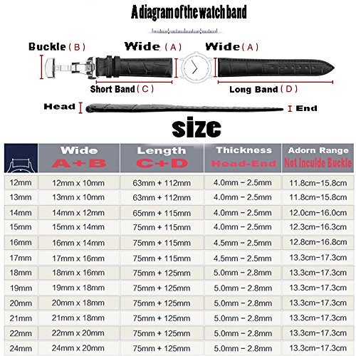 [Description] 100% brand leather watch band.Made of genuine calf leather. This leather watchbands width:22mm(approximately 0.866 in)_fit 22mm watch lug and comes with a 20mm replacement buckle This leather watch band length: 125mm(approximately 4.921 in)/75mm(approximately 2.953 in)_ the total length when fixed together is 5.5 inch to 7.1 inch. Plus the length of your watch case to see if it fits your wrist or not. The leather watch strap is standard style_ can fit most watches_ can fit Timex_Seiko_CITIZEN_Swatch_FOSSIL_Casio_Cartier_Tissot_Panerai_IWC_OMEGA_LONGINES_AUDEMARS PIGUET_PATEK PHILIPPE_MONTBLANC_VANCHERON CONSTANTIN_JAEGER-LeCoultre_PIAGET and so on In Acunion_ if you have any questions or dissatisify_ please let us know immediately. We believe we can build a good communication can solve most of any issues.