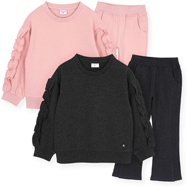 부드러운 면소재에 편안한 핏의 상하세트에요. 상의는 편안한 스타일이지만 소매부분 프릴포인트로 귀여운 느낌을 주는 아이템이에요. 하의는 세미부츠컷으로 멋스러우면서도 편안하답니다. 세트상품이지만 따로 또 같이 다양하게 코디할 수 있어요~~