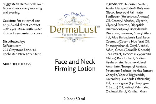 -. Binding : Misc. -. Brand : DermaLustTM -. EAN : 0617723920876 -. Feature : Uses peptides to boost collagen production, provide incredible moisture, and visibly firm the skin / Can be used under make-up as well -. Label : Dr. Patel's® -. Manufacturer : Dr. Patel's® -. PackageQuantity : 1 -. ProductGroup : Beauty -. ProductTypeName : BEAUTY -. Publisher : Dr. Patel's® -. Studio : Dr. Patel's® -. Title : DermaLust Face and Neck Firming Lotion with peptides to boost collagen production, provide incredible moisture, and visibly firm the skin to reverse the signs of aging. -. UPC : 617723920876