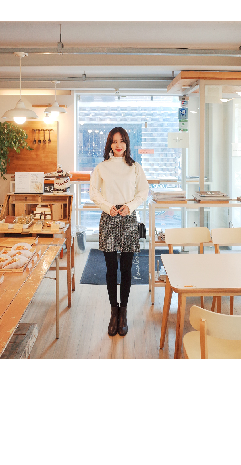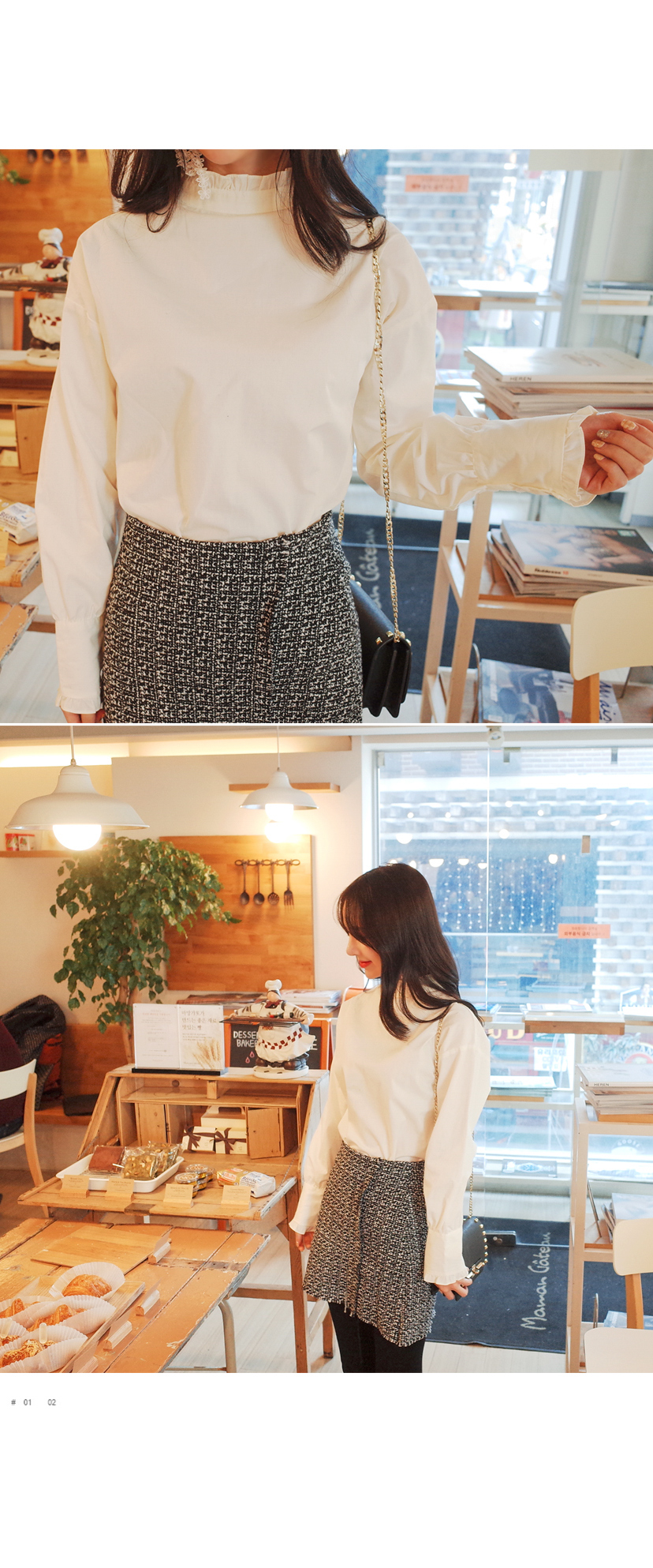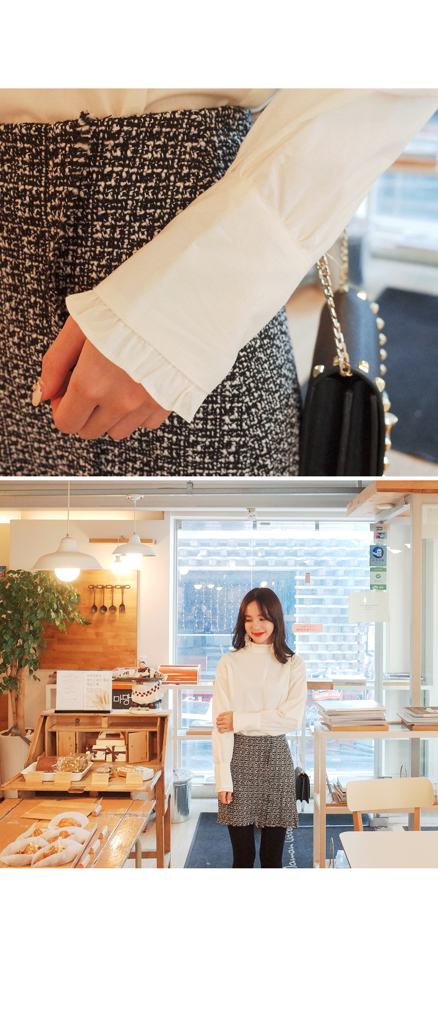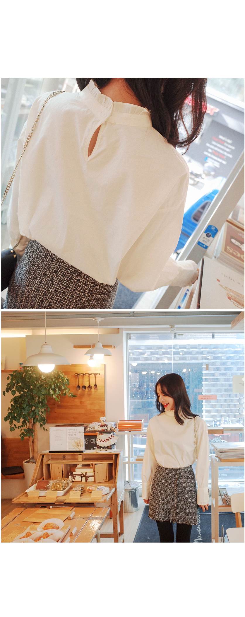 넥라인에 프릴디테일이 여성스러우며