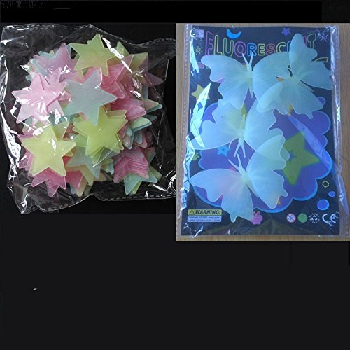 -. Feature : DIY Wall Stickers,100pcsluminous stars and 4 butterflies . / Install area : It can be stuck to any smooth surfaces: walls, furniture, accessories, tiles, mirrors and windows / Removable, Repositionable without leaving any trace. / Ideal to decorate nurseries, children's bedrooms, playrooms, classrooms etc within seconds / good gift for kids rooms,Glow in the dark, you can see beautiful stars and butterflier at night,
