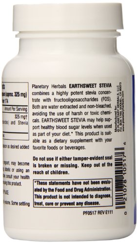 -. Binding : Health and Beauty -. Brand : Planetary Herbals -. EAN : 0021078105176 -. Feature : Suitable as a dietary supplement with your favorite foods or beverages / May help support healthy blood sugar levels when used as part of your diet / Concentrate with fructooligosaccharides (fos) -. IsAdultProduct : 0 -. IsAutographed : 0 -. IsMemorabilia : 0 -. Label : Planetary Herbals -. LegalDisclaimer : * These statements have not been evaluated by the Food and Drug Administration. This product is not intended to diagnose, treat, cure or prevent any disease. ** Always refer to the manufacturer's label on the product for description, recommended dose and precautions. -. Manufacturer : Planetary Herbals -. MPN : 021078105176 -. NumberOfItems : 1 -. PackageQuantity : 1 -. PartNumber : 021078105176 -. ProductGroup : Health and Beauty -. ProductTypeName : HEALTH_PERSONAL_CARE -. ProductTypeSubcategory : 12105025 -. PublicationDate : 2013-08-20 -. Publisher : Planetary Herbals -. ReleaseDate : 2015-06-22 -. Size : 2 oz -. Studio : Planetary Herbals -. Title : Planetary Herbals Stevia Earthsweet with FOS Powder, 2 Fluid Ounce -. UPC : 021078105176