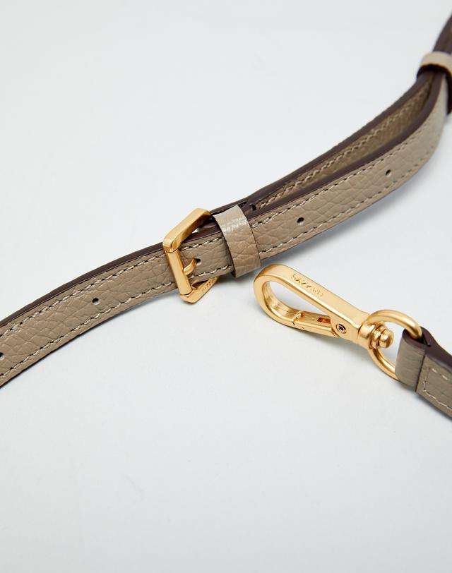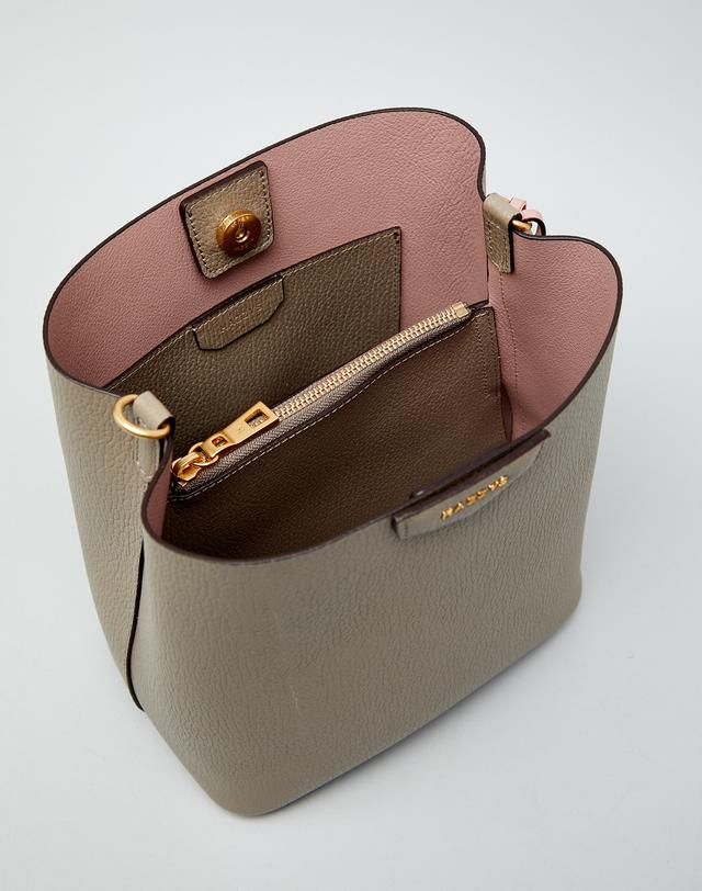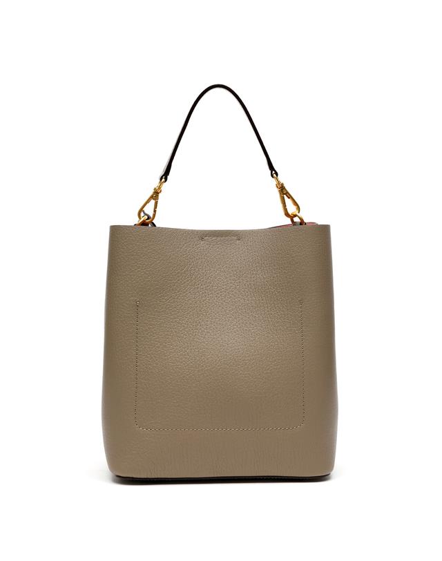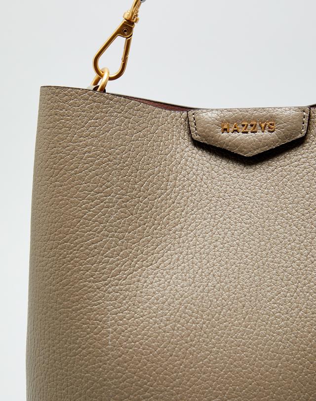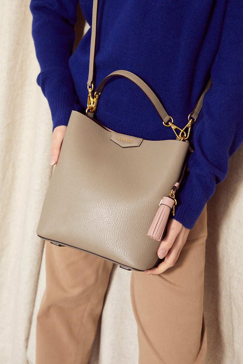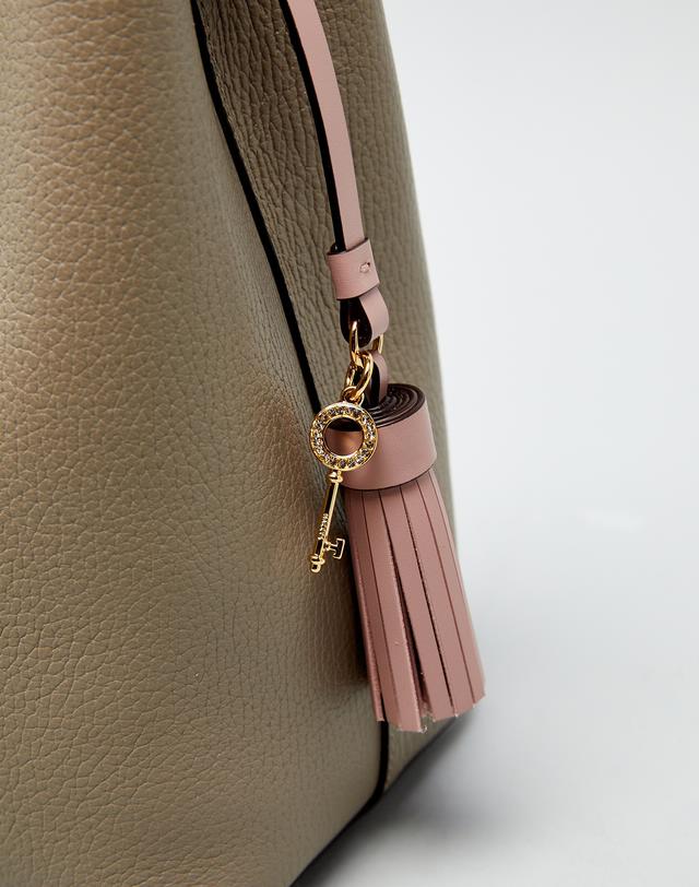 그레이 컬러 바탕에 베이직한 디자인으로 인디핑크 태슬 참 장식과 HAZZYS 골드 로고로 포인트를 준 버켓백 입니다.