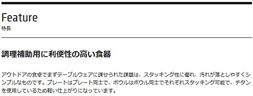 티타늄(티탄)제의 초경량인 플레이트입니다.솔로의 단독 행동으로 활약합니다.플레이트는 플레이트 끼리와 각각 스타킹 할 수 있는 때문에,오토 캠프 시도 재차 운반할 수 있습니다.