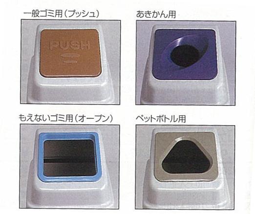 ※画像左から、オープン 一般ゴミ(茶)、オープン もえるゴミ(赤)、プッシュ もえないゴミ(青)、プッシュ プラスチック(白)、丸穴 あきかん(紺)、丸穴 あきびん(緑)、三角穴 ペットボトル(灰)