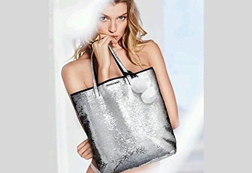 -. Feature : Victoria's Secret Silver Sequin Tote Bag / Features: Removable Fur Ball / Dimensions: 16.25" wide x 15.5" height x 4.25 depth Strap: 9 inch Drop / Style: Sequin Tote Bag / Color: Silver Sequin exterior / Black interior