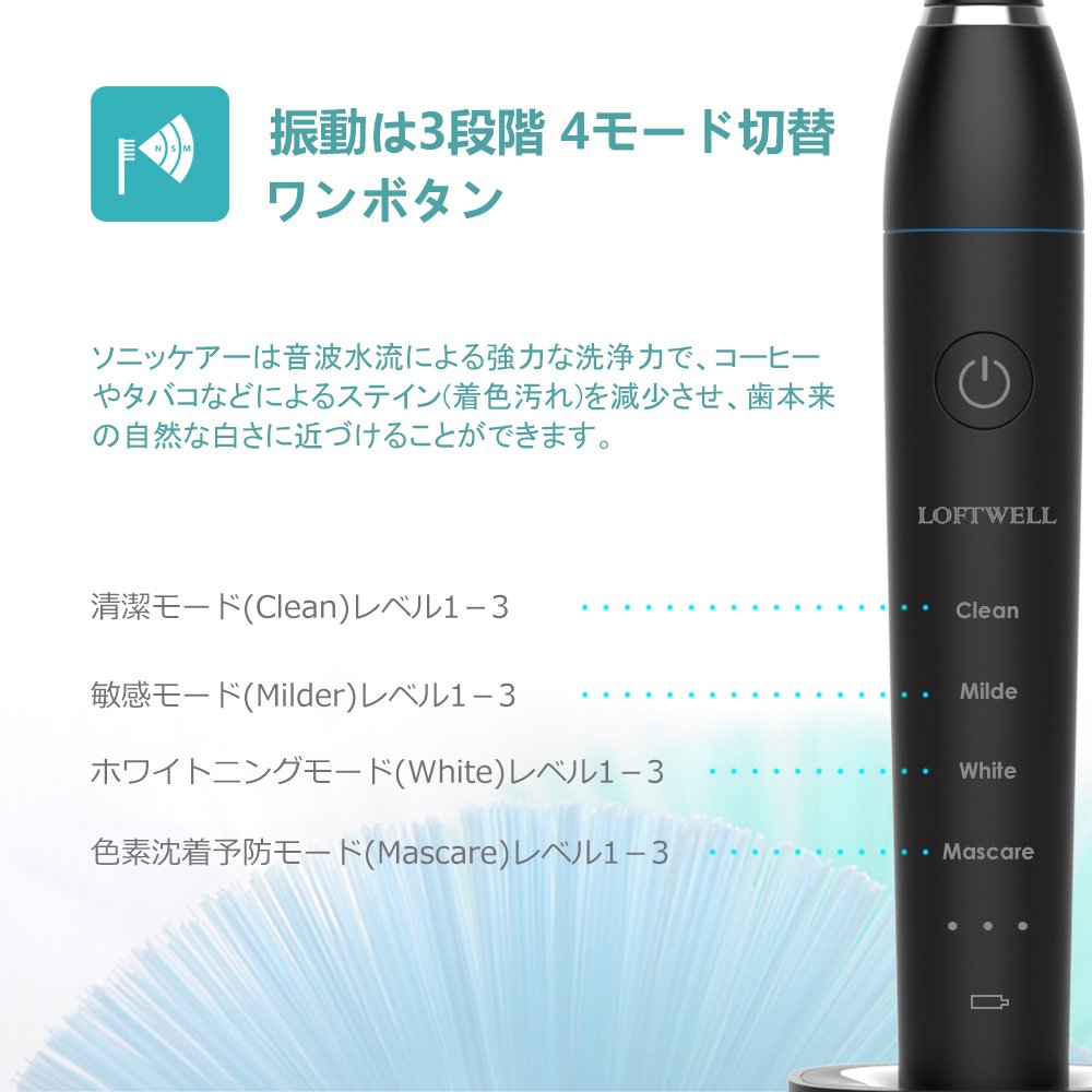 · 4 pigmentation prevention mode (Mascare) Level 1 - 3 (25000 times / minute to 29000 times / minute) After the mouth with strong pigment such as coffee, tobacco, wine, the pigmentation is deposited by disciplined high vibration