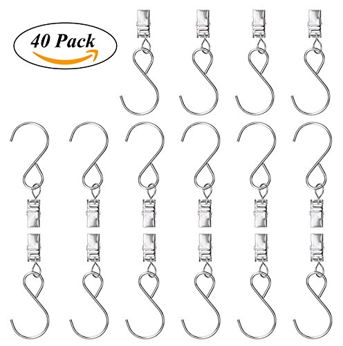 Gutter Hangers for Lights, Coideal 40 Pack Party Light Hanger Clips with S Hook for Hanging, Stainless Steel Curtain Clip / Metal Wire Holder for Rope String Lights, Outdoor Activities (Silver)