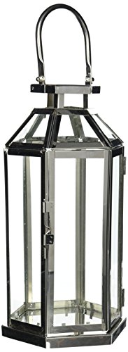 -. Feature : This stainless steel lantern is modern, dramatic and stunning. / Dimensions: 6 5/8" x 5 3/4" x 13 3/8" high 17" high with handle. / Item weight: 2.4 lbs. / Material : Stainless steel and glass. / Candles (not included).