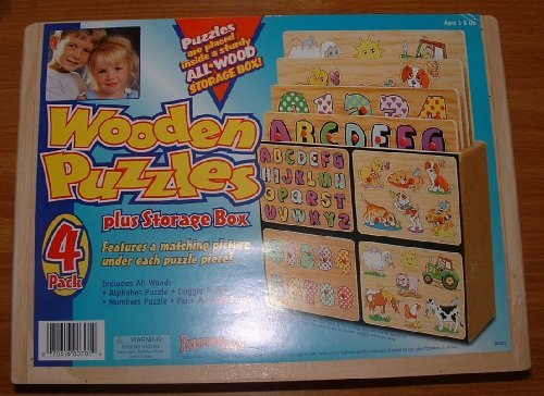 -. Feature : 4 pack / Includes Alphabet, Doggie, Numbers & Farm Animals puzzles / All Wood / Sturdy All Wood Storage Box / features a matching picture under each puzzle piece