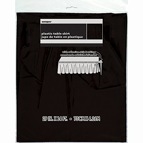 - Feature : One Black Table Skirt per package / Black Plastic Table Skirt measures 14 ft. X 29" / Add color accent to any table / Place table skirt on any table to create under table storage space without the eyesore / Search for other Midnight Black party supplies and party decorations from Unique