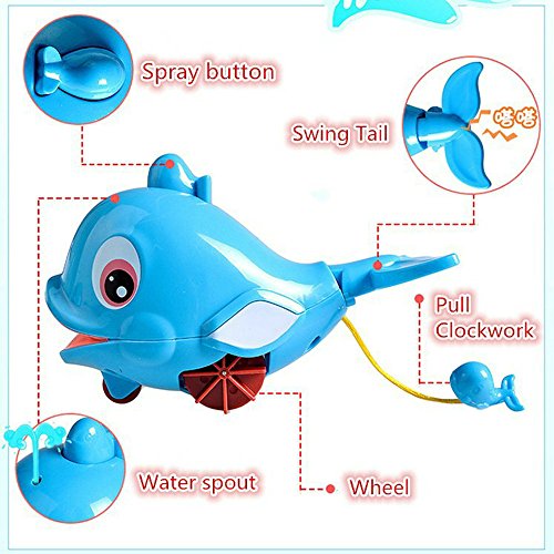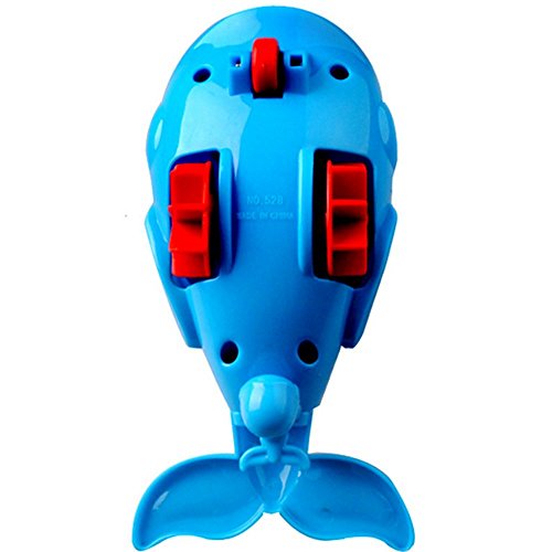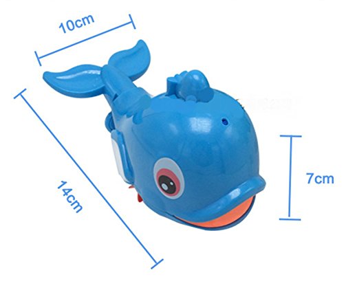 -. Feature : Put this lovely toy into the water, it will automatically suck water, press the small button on the it's head, it will spray water. / Rotate the clockwork, it's tail will move up and down that gives a lot of fun. / Pull down the clockwork, it will run forward, very funny. / The wheels can be walked on the ground and swim in the water as well. / Realistic cartoon shape, stimulate baby's senses, and help to develop baby's thinking abilities.