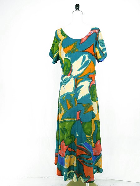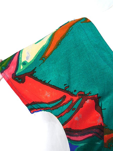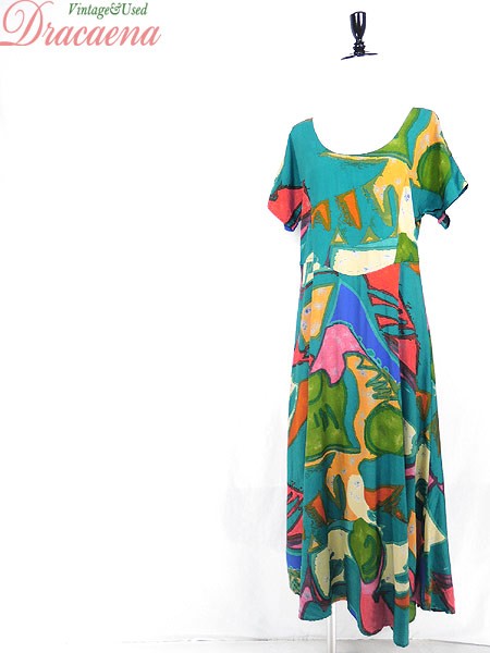 Ladies ブランド- カラー緑ベース メール便不可 コンディション★★★ 素材レーヨン 表記サイズ10 スタッフコメント裏地なし 実寸サイズ 着丈 125 cm 身幅 46 cm 袖丈 24 cm ウエスト 35 インチ( 88 cm) ※ウエスト・ヒップ以外は平置き採寸