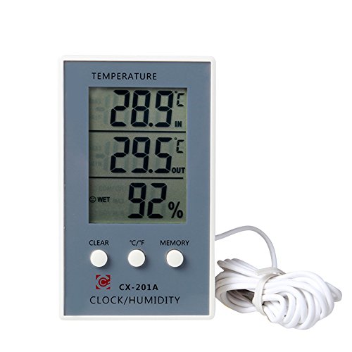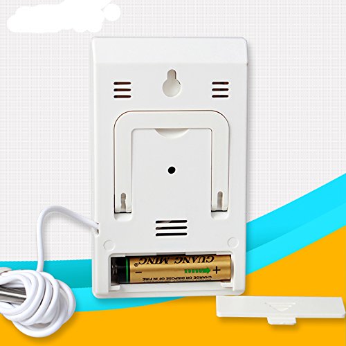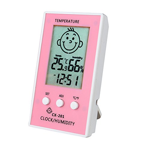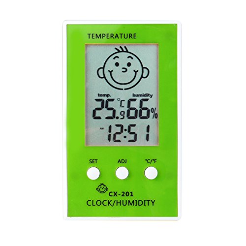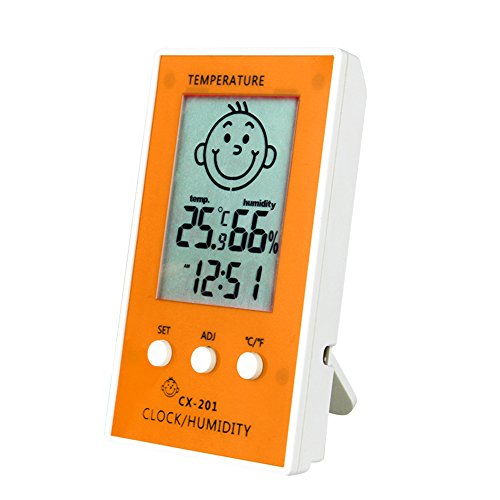 -. Feature : Large LCD high definition screen with a protective film,show the temperature,the humidity and the time,easy-to-read tells indoor & outdoor temperature,and indoor humidity / With a smiling happy or a sad face to remind you the most comfortable environment to live directly,Celcius and Fahrenheit degrees switching function. / The temperature and humidity are showed by large numbers,you can konw the waether condition directly,high accuracy and high stability.The happy smiling face or sad face tell you the most comfortable living condition directly. / Takes 1 AAA battery, not included,low power consumption,the 12/24-hour set clock with the time alarming function ,simple to adjust and easy to use. / The Mini Thermometer Hygrometer can used in the kitchen,bedroom,factory,car,etc.It includes a holding plastic stand for tabletop placement or hanging on the wall.