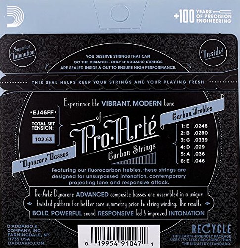 Studio : D'Addario Co. Inc Publisher : D'Addario Co. Inc Binding : Electronics Product Description EJ46FF, hard tension, features Pro-Arte Carbon trebles and Dynacore basses for unsurpassed superior intonation with the perfect blend of tone, brightness, and projection. Experience the vibrant, projecting contemporary tone of D'Addario's Pro Arte Carbon strings. Designed to the exacting specifications of our Pro Arte nylon trebles, our fluorocarbon strings deliver unmatched superior intonation, a responsive attack and modern projecting tone. Paired with the bold and powerful Dynacore basses, Pro Arte Carbons offer the ideal combination of tension and tone for today's classical player. 0