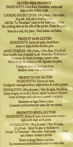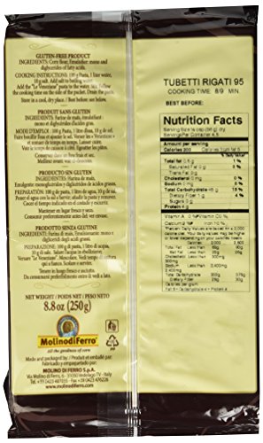 -. Binding : Misc. -. Brand : Le Veneziane -. Feature : The Le Veneziane corn pasta gets its characteristic golden color from its rich natural carotenes (vitamin A) / This corn pasta has a delicate and gentle taste that allows it to work with any sauce / It taste just as good as (some say better than) regular wheat pasta / gluten free corn pasta -. Label : Molino di Ferro -. Manufacturer : Molino di Ferro -. MPN : P108 -. PackageQuantity : 1 -. PartNumber : P108 -. ProductGroup : Grocery -. ProductTypeName : GROCERY -. Publisher : Molino di Ferro -. Studio : Molino di Ferro -. Title : Le Veneziane Italian Gluten Free Corn Pasta Tubetti Rigate 250