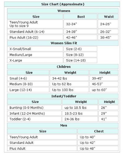Size small fits children 39 to 45 inches tall, with a recommended weight range of 38 to 42 pounds