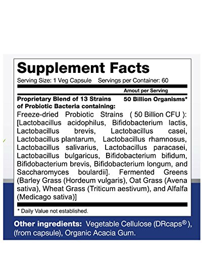 COMPLETE PROBIOTIC 50 BILLION: One capsule per day, 50 billion CFUs & 13 power and effective strains. 60 capsules in a glass amber bottle and 2 months supply