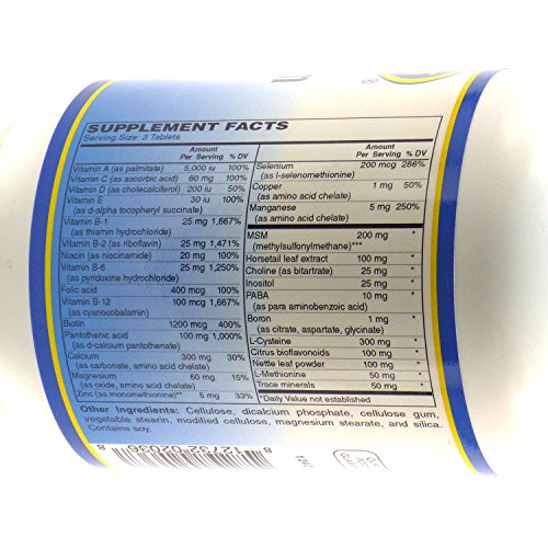 Hair, Skin and Nails provides all the necessary nutrients, minerals and vitamins for healthy vibrant looking skin, nails and hair. Our multi-vitamin contains biotin, MSM, horsetail leaf Extract, inositol, PABA, boron and nettle leaf powder; long known supplements that provide a healthy looking appearance by promoting beauty from the inside out! As a dietary supplement, adults take three (3) tablets daily at meal time, or as directed by a health care professional. Store in a cool dry place and away from direct light. These statements have not been evaluated by the Food and Drug Administration. This product is not intended to diagnose, treat, cure, or prevent any disease.Feature